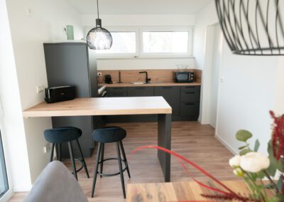 Die komplett ausgestattete Einbauküche mit Theke bietet alles, was man zum täglichen Leben braucht (Kühlschrank, Backofen, Herd mit Ceranfeld, Spülmaschine, Wasserkocher, Toaster, Kaffeemaschine etc.).