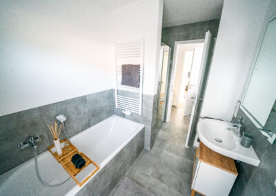Die Wohnung Löwenpudel verfügt über ein Badezimmer mit getrennter Toilette, Dusche und Badewanne.